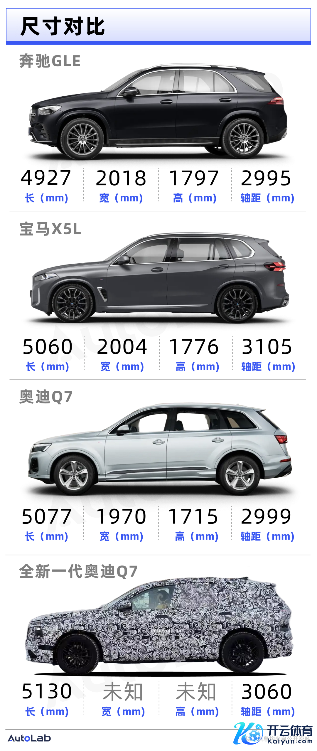 四肢对比,咱们也陈列了它的两位老敌手良马X5和奥迪Q7的尺寸信息。