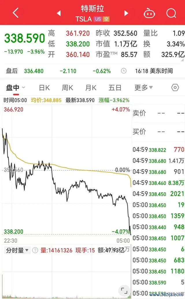 特斯拉报338.59好意思元,跌3.96%,市值1.1万亿好意思元,其市值通宵挥发448亿好意思元(约合东谈主民币超3200亿元)。