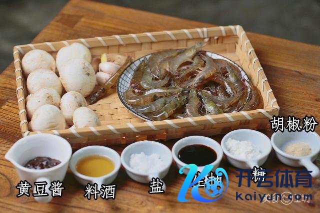1. 鲜虾提前洗净并去掉虾线、虾须和虾枪后,用盐、料酒和胡椒粉拌匀腌制,蘑菇切片备用,黄豆酱、生抽、糖加一丝盐调成酱汁。