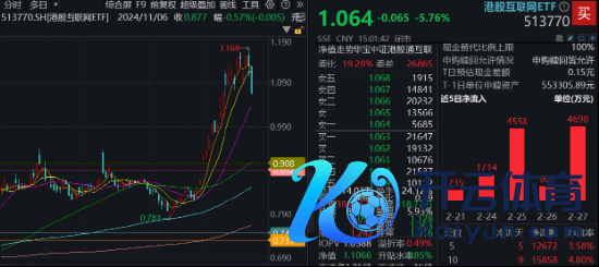 热点ETF方面,重仓港股互联网龙头的港股互联网ETF(513770)全天低开低走,场内价钱收跌5.76%,失守10日线,全天成交额8.87亿元。