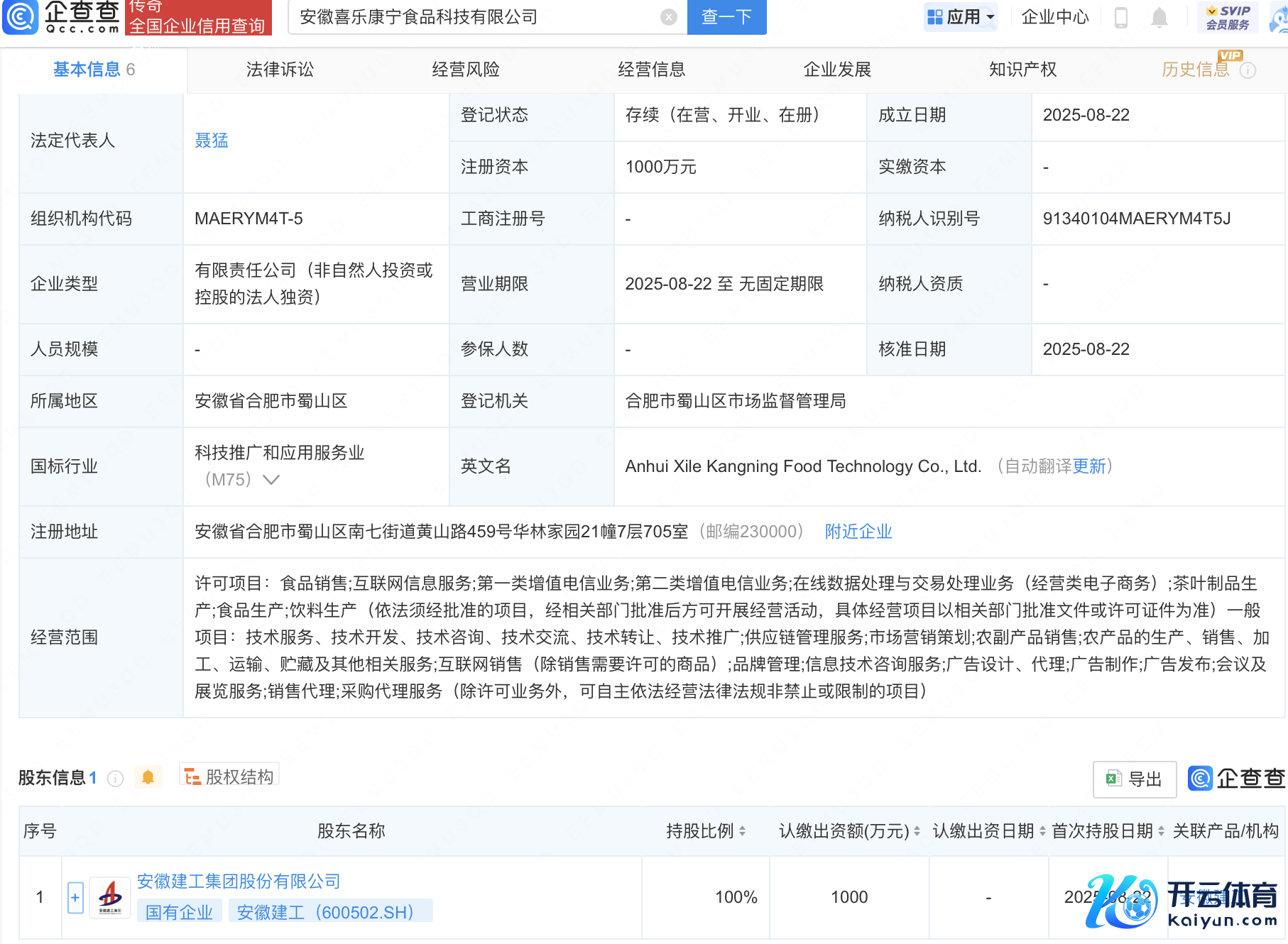 企查查APP显露,近日开yun体育网,安徽喜乐康宁食物科技有限公司竖立,注册成本1000万元,认识畛域包含:食物销售;互联网信息做事;第一类升值电信业务;第二类升值电信业务等。企查查股权穿透显露,该公司由安徽建工(600502)全资捏股。