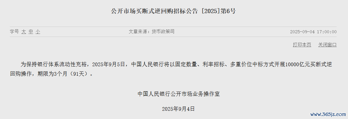 央行:9月5日将开展10000亿元买断式逆回购操作 期限为3个月央行:9月5日将开展10000亿元买断式逆回购操作 期限为3个月