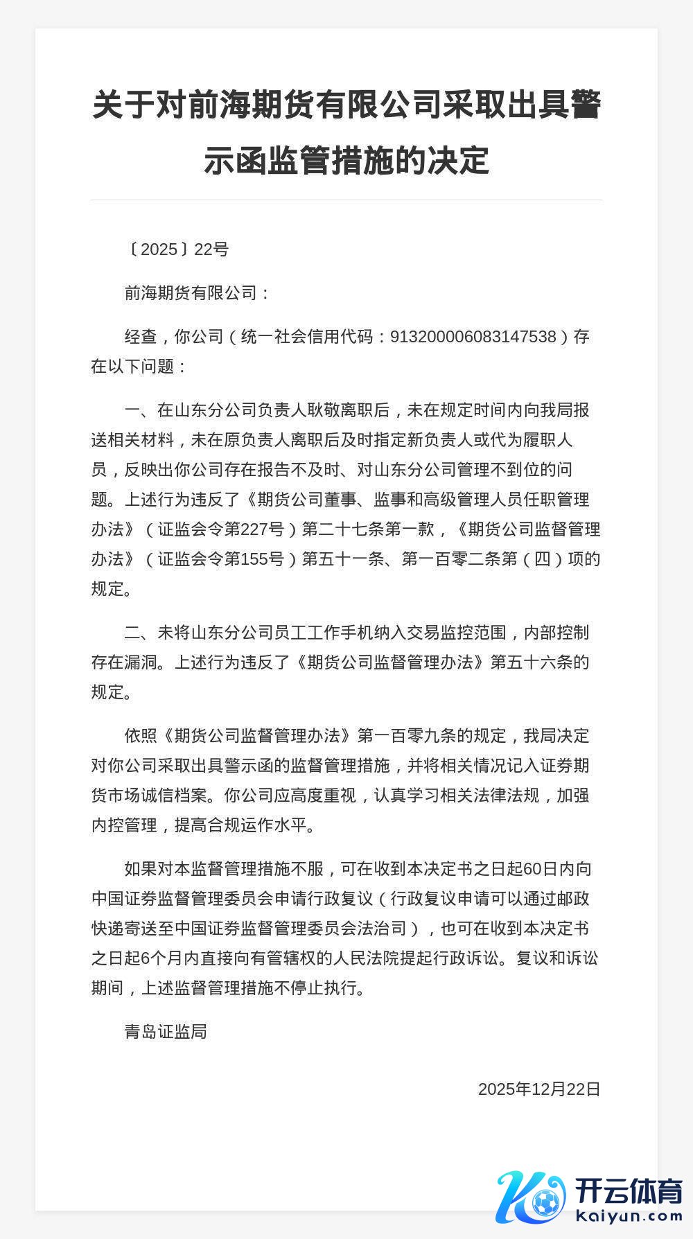 蓝鲸新闻12月25日讯,近日,青岛证监局发布行政监管要领决定书开yun体育网,剑指前海期货有限公司。