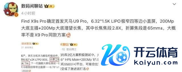 其他产物细节方面,OPPO Find X9s Pro详情首发天马U9 Pro,6.32"1.5K LIPO极窄四等边小直屏,200Mp大底主摄+200Mp大底潜望长焦,其中长焦焦段2.8X,折算焦段是65mm±,简略率不是X9 Pro同款有盘算推算。