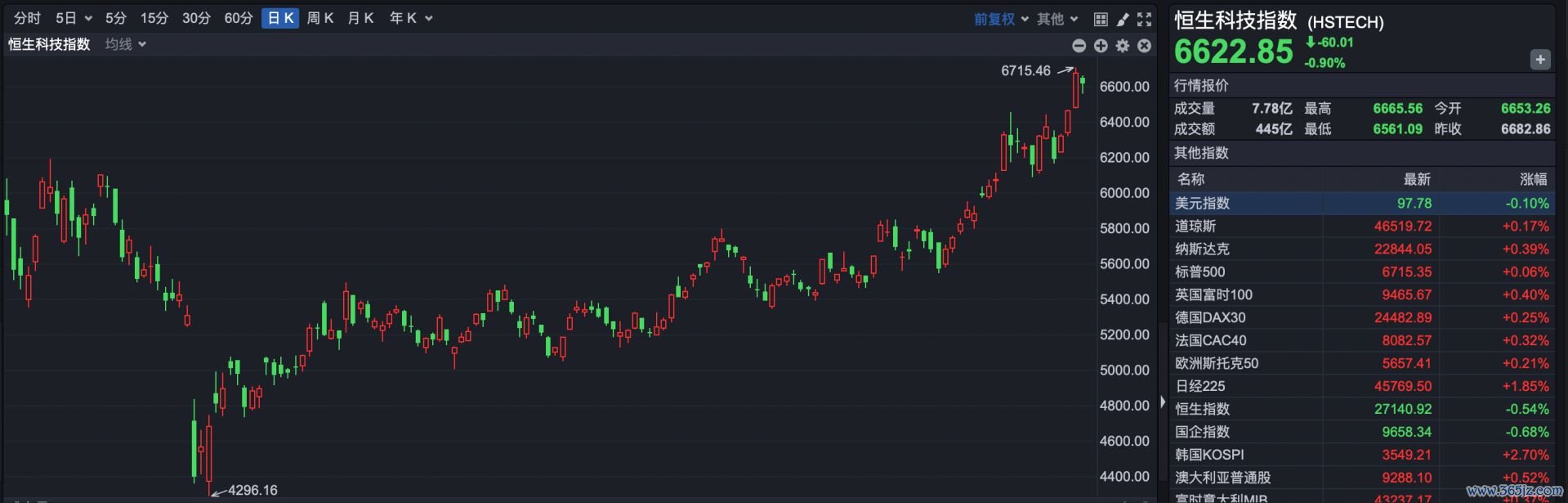 恒生科技指数报收于6622.85点,下落60.01点,跌幅0.90%。